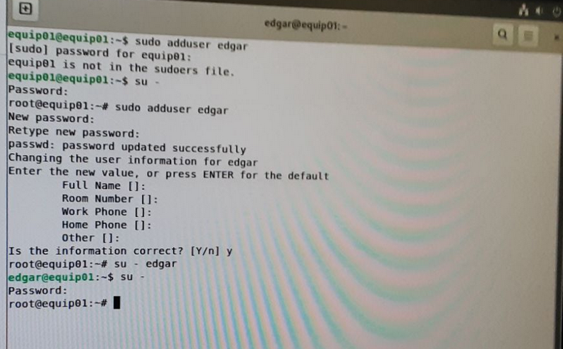 Per començar, has de posar, “sudo adduser (usuari que vulguis)”. Si poses, “su -“, això és per entrar a l’usuari ‘root’.