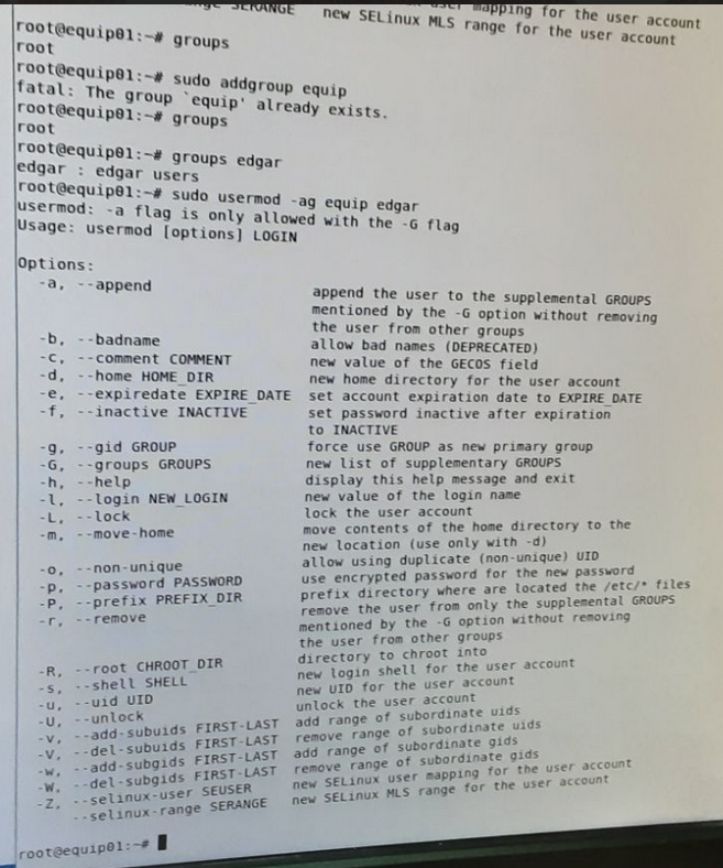 Aquesta captura mostra un error típic en utilitzar “usermod -a” sense combinar-lo amb ‘-G’ (l’opció ‘-a’ només funciona amb ‘-G’ per afegir grups suplementaris), seguit de la sortida completa de “usermod –help” que llista totes les opcions de l’ordre per modificar comptes d’usuari a Linux.