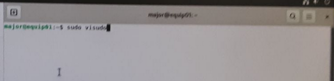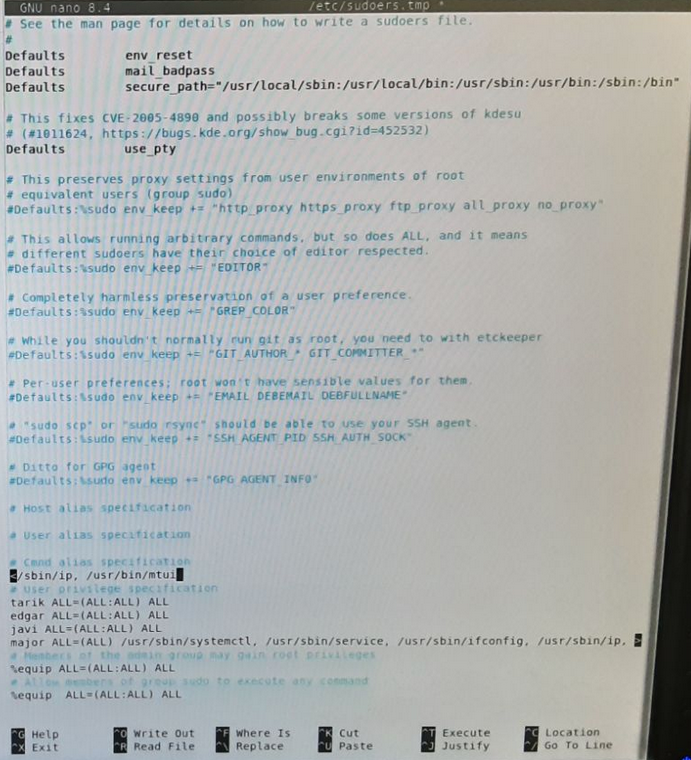 Sortirà això, baix de la imatge on posa ‘# user privilege specification’, posa el nom d’usuari i després ‘ALL=(ALL:ALL) ALL’ als usuaris. On posa ‘# cmnd alias specification’, posa ‘</sbin/ip, /usr/bin/mtui’. També als últims ‘#’ posa al mateix que els usuaris, però amb el nom del grup que tens.