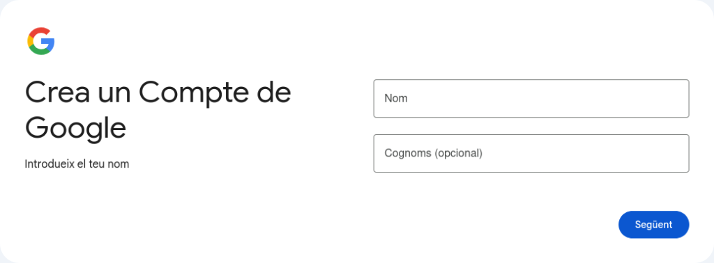 Per a crear un compte de Gmail primer mana a posar el teu nom i cognoms (opcional).