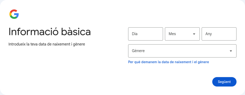 Després has de posar la teva data de naixement, dia, mes, any i el teu sexe (pots posar altres sexes o no posar res). Si crees un compte per a un menor posa més coses que fer, DNI, tutors etc…