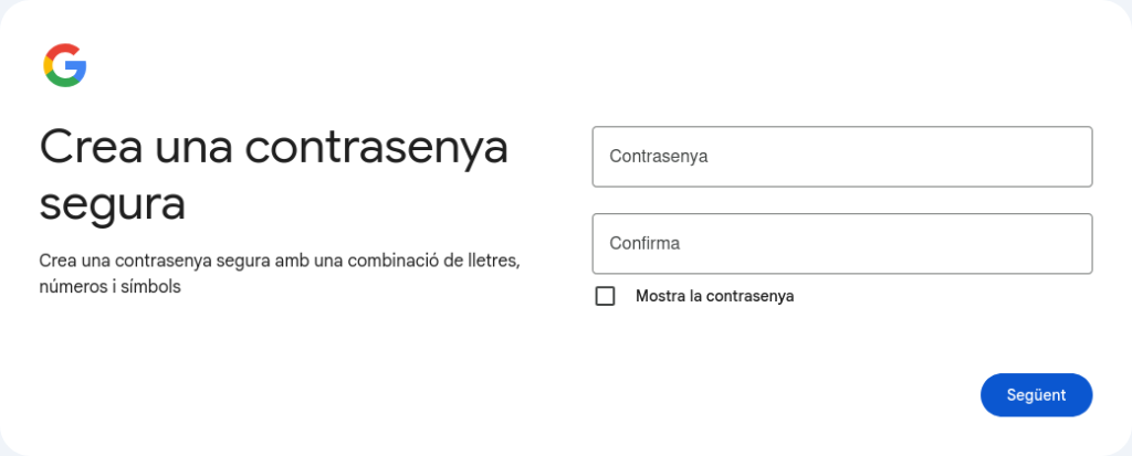 Després crea la teva contrasenya, recorda sempre posar majúscula, minúscula, números i símbols. Exemple: Aa8. (clarament posa la contrasenya més llarga)
