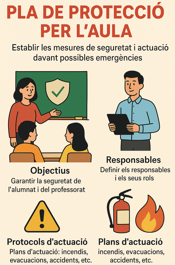 Un pla de protecció per a l’aula és un document que estableix les mesures de seguretat i actuació davant possibles emergències. Té com a objectiu garantir la seguretat de l’alumnat i del professorat, prevenint riscos i assegurant una resposta ràpida i ordenada. Inclou protocols per a situacions com incendis, evacuacions o accidents. També defineix els responsables i els recursos disponibles per actuar de manera eficient.